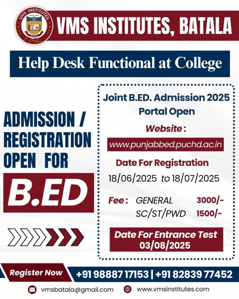 VMS College of Education, officially known as Shri Vishwa Mitter Sekhri College of Education, offers a 2 years full-time Bachelor of Education (B.Ed.) program. This undergraduate course is designed to prepare graduates for teaching roles at the secondary and higher secondary levels.